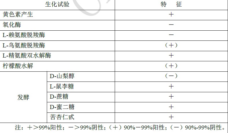 自TSA 平板上直接挑取黄色可疑菌落,进行生化鉴定。阪崎肠杆菌的主要生化特征见下表。可选择生化鉴定试剂盒或全自动微生物生化鉴定系统。