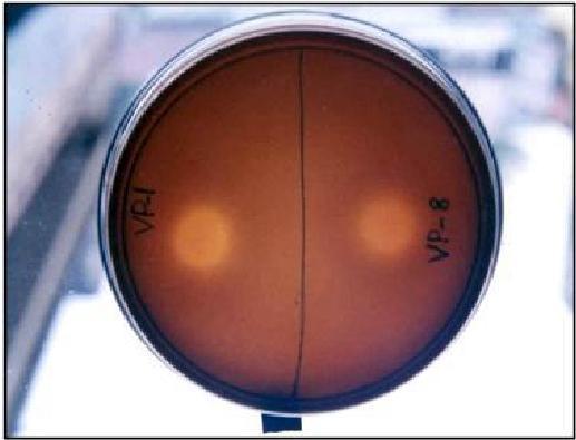用接种环将测试菌株的3%氯化钠胰蛋白胨大豆琼脂18h培养物点种表面干燥的我妻氏血琼脂平板。每个平板上可以环状点种几个菌。36 ℃±1 ℃培养不超过24 h,立即观察。阳性结果为菌落周围呈透明环的β溶血。