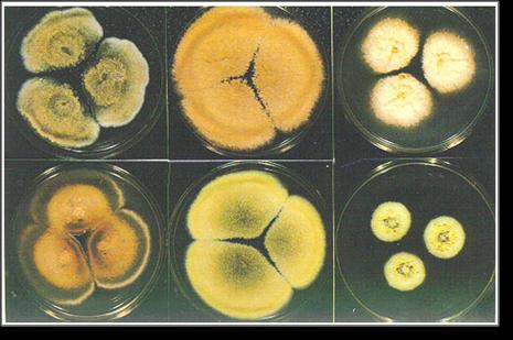 霉菌菌丝粗长,其菌落疏松,呈绒毛状、棉絮状或蛛网状。有的菌落呈圆形,有的无定形。由于其形成的孢子不同故其菌落常呈现肉眼可见的不同结构和色泽特征。
