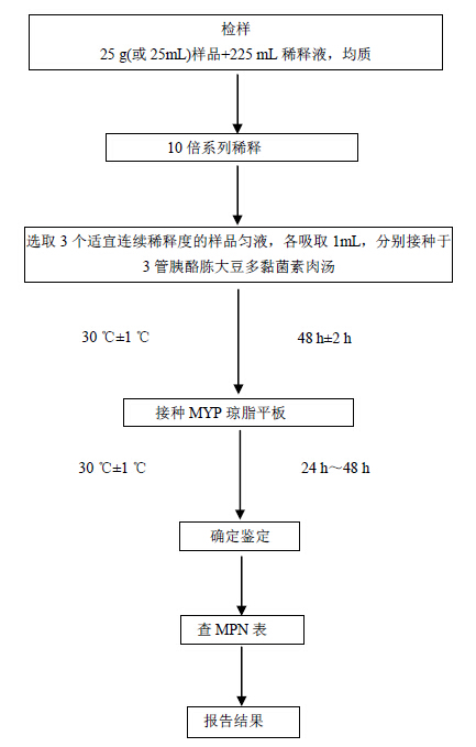 取3个适宜连续稀释度的样品匀液(液体样品可包括原液),接种于10 mL胰酪胨大豆多黏菌素肉汤中,每一稀释度接种3管,每管接种1 mL(如果接种量需要超过1 mL,则用双料胰酪胨大豆多黏菌素肉汤)。于30 ℃±1 ℃培养48 h±2 h。