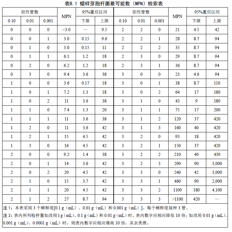 根据证实为蜡样芽胞杆菌阳性的试管管数,查MPN检索表(见附录B),报告每g(mL)样品中蜡样芽胞杆菌的最可能数,以MPN/g(mL)表示。