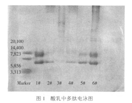 图1 是市售酸乳中多肽的电泳图谱,虽然有一点条带畸形和拖尾现象,但仍然可以较为清晰