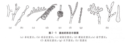 在适宜条件下,真菌由于包子生出芽管,逐渐延长呈丝状,生物学上把真菌的每一根细丝叫菌丝(图2 - 5) 。菌丝所形成的集团称为菌丝体(mycelium ) 。