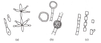 (1)叶状于孢子: 由菌丝(或母细胞)直接形成的生殖于孢子,故也称为菌丝性孢子,根据其形状又分为3 种(图2 - 6) 。