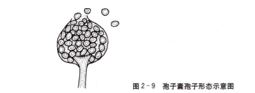 (3) 孢子囊于孢子: 生长于一种囊状结构孢子囊内的孢子,称为孢子囊孢子(图2 - 9) 。孢子囊的形状分为筒状、球状或梨状,其中含有大量孢子囊孢子,常见于毛霉、犁头霉和根霉等。