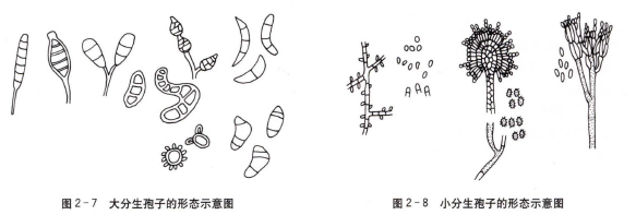 (2) 分生孢子: 由菌丝分化出来的特殊结构叫分生孢子梗,在分生孢子梗上着生的孢子称为分生孢子。根据其大小及形态可分为大分生孢子( 图2 一7) 及小分生孢子(图2 - 8) ,其形态有圆形、梨形、棍棒形或纺锤形等,无色或着色。