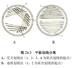 3.纯培养:记录优势菌株的菌落特征并编号,然后将其划线接入试管斜面。根据已掌握的知识进行判断,细菌用牛肉膏蛋白胨培养基,放线菌用高氏一号培养基,真菌用PAD培养基。见图24-3。分别在相应培养基平板上划线分离单菌落,待长好后再次划线接入试管斜面,以备鉴定、保存使用。
