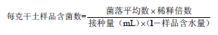 计数时通常选用每种微生物生长的最适稀适度的三个平皿计数, 如细菌、放线菌和酵母菌以每皿30~300 个菌落为宜,丝状真菌则以每皿10~100 个菌落为宜。将原始结果填入下表,根据事先测定的土壤含水量,按公式计算出每个干土中微生物的量。