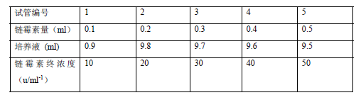 2.按下表配置不同链霉素浓度的培养基(每个试管3 个重复):
