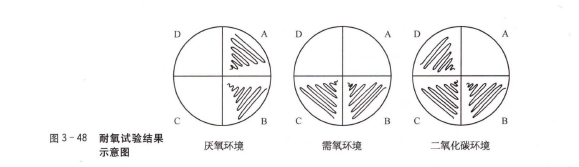 凡在厌氧环境生长,而在需氧和二氧化碳环境中不生长的细菌为专性厌氧菌(图3 - 48 中A 区) ;在需氧和厌氧环境中均能生长者为兼性厌氧菌(图3 - 48 中B 区) ;在需氧和二氧化碳环境中生长,而在厌氧环境中不生长者为专性需氧菌(图3 - 48 中C 区) ;在需氧、厌氧环境中均不生长或生长不佳,而在二氧化碳环境中生长良好的细菌为需二氧化碳菌(图3 - 48 中D 区) 。