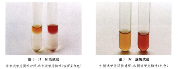 (1)原理:有些细菌具有色氨酸酶,能分解培养基中的色氨酸,生成吲哚,吲哚与试剂对二甲氨基苯甲醒作用,形成玫瑰蚓味而呈红色。