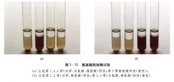 (1)原理: 有些细菌能产生某种氨基酸脱殷酶,使该种氨基酸脱去援基,生成胶(如赖氨酸→尸肢,鸟氨酸→腐肢,精氨酸→精胶) ,从而使培养基变碱性,指示剂变色。