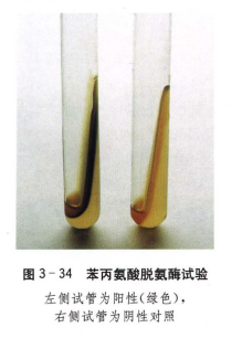 (1) 原理: 有些细菌能产生苯丙氨酸脱氨酶,使苯丙氨酸脱去氨基生成苯丙酣酸,与三氯化铁作用形成绿色化合物。