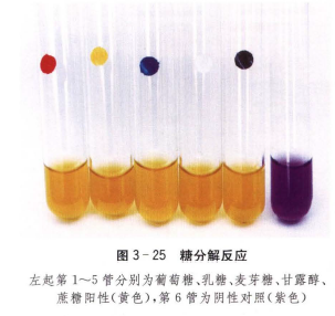 (3) 结果判断: 若细菌能分解此种糖类产酸,则指示剂呈酸性变化;不分解此种糖类,则培养基无变化(图3 - 25) 。产气可使液体培养基中倒置的小管内出现气泡,或在半固体培养基内出现气泡或裂隙。