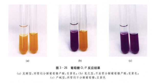 (3) 结果判断: 仅开放管产酸为氧化反应, 2 管都产酸为发酵反应, 2 管均不变为产碱型(图3 - 26) 。