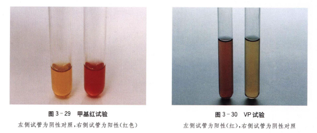 (1) 原理: 某些细菌能分解葡萄糖产生丙酣酸,并进一步将丙酮酸脱羧成为乙酰甲基甲醇,后者在碱性环境中被空气中的氧氧化成为二乙酰,进而与培养基中的精氨酸等所含的胍基结合,形成红色的化合物,即VP试验阳性。