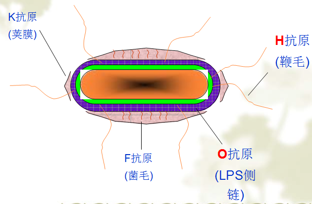 菌体O抗原(超过170种):耐热,存在于细胞壁脂多糖层。