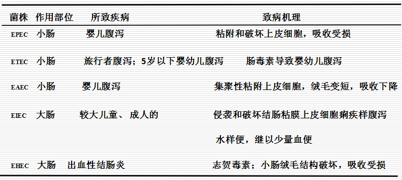 致泻性大肠埃希氏菌分为肠致病性大肠埃希氏菌(EPEC),肠产毒性大肠埃希氏菌(ETEC),肠出血性大肠埃希氏菌(EHEC),肠侵袭性大肠埃希氏菌(EIEC),肠集聚性大肠埃希氏菌(EAEC)。