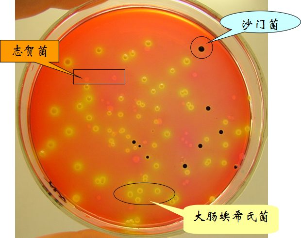 XLD琼脂:培养基中含有去氧胆酸钠作指示剂,在该浓度下的去氧胆酸钠也同时作为大肠埃希氏菌的抑制剂 ,而不影响沙门菌属和志贺菌属的生长。