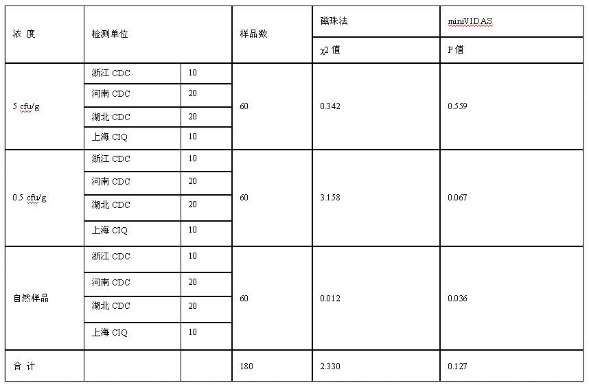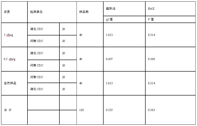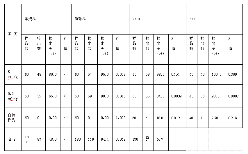 -结果判断:常规法与免疫磁珠捕获方法、VIDAS、BAX方法的配对比较检验,用统计学的方法Chi-square Test(X2检验)进行分析;仪器法与磁珠法进行两两配对检验,经χ2检验进行分析。仪器法与磁株法比较,假阳性率≤10%、假阴性率≤2%为可接受方法。