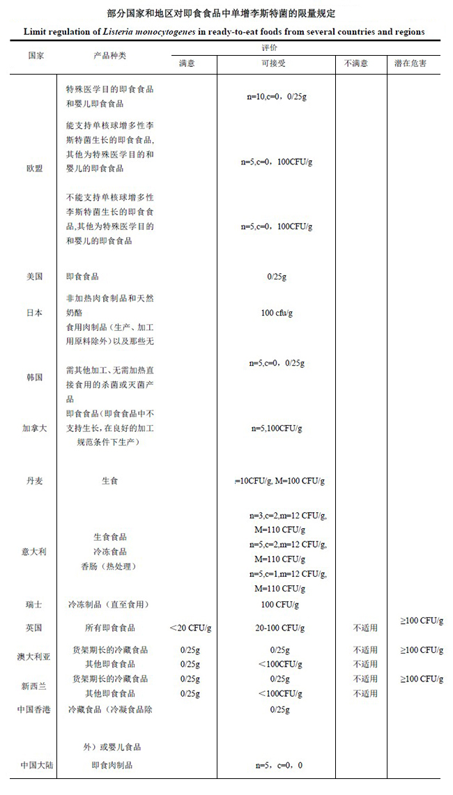->部分国家和地区对即食食品中单增李斯特菌的限量规定