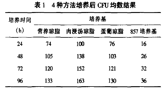 2.3 4种培养基的CFU均数间两两比较:除营养琼脂培养基与蛋白胨葡萄糖琼脂培养基之间CY'U均数的差异无显著性外,肉浸汤琼脂培养基与营养琼脂培养基、肉浸汤琼脂培养基与蛋白胨葡萄糖琼脂培养基、肉浸汤琼脂培养基与857培养基、营养琼脂培养基与857培养基、蛋白胨葡萄糖琼脂培养基与857培养基、CFU均数的差异均有高度显著性(P<0.01)。