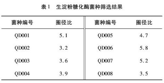 从初筛平板上挑出了8株有较大淀粉水解圈的菌株,分别编号为QD001到QD008。测得它们各自的圈径比见表1,对圈径比较大的菌株QD001、QD006和QD007做斜面保藏并通过摇瓶复筛,得到QD006酶活力最高,达到10、18U/ml,确定为目标菌株。