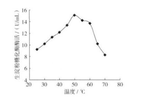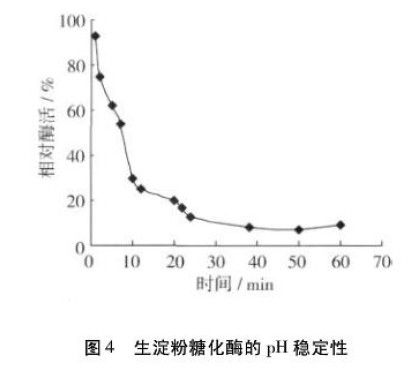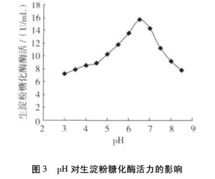 由图3可知,该酶的最适为6.5左右,同时可以看出pH在3-4.5的范围内,生淀粉糖化酶的酶活变化不大,上升趋势比较小,但pH对生淀粉糖化酶的影响呈现出明显的钟罩形。