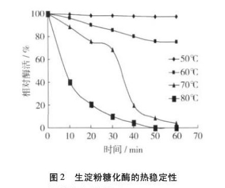1.6.1 酶的热稳定性研究 取一定量的粗酶液,分别在50℃、60℃、70℃和80℃不同温度下保温60min,每隔10min测定残留酶活力。