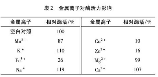 1.6.5 金属离子的影响 以不加金属离子为对照,分别在反应液中加入1mmol/L的Ca2+、Na+、Mg2+、Fe3+、K+、Mn2+、Zn2+和Cu2+,测定酶活。