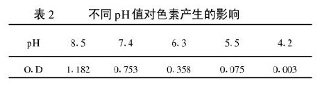 由表1结果看出,色素的产生与葡萄糖浓度有一定的正相关性,但从O.D值与葡萄糖浓度比值看出,糖浓度越高相对色素产生的越少。因此以下试验以20%为基本浓度。