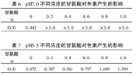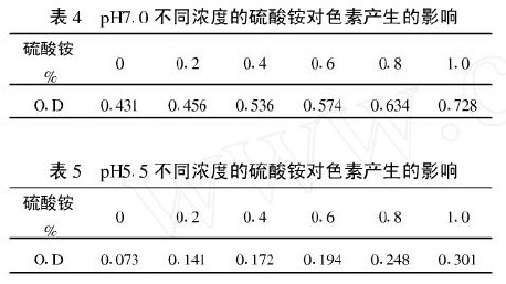 由表4、表5的结果看出,葡萄糖中加入硫酸铵可以使色素加重,但降低pH值相应可大大减轻色素的产生。