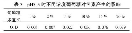 由表2的结果看出,pH值对色素的产生有较大的影响,pH值低于5.5时,色素产生极少,不同浓度葡萄糖,pH值5.5,115℃灭菌15min,结果见表3