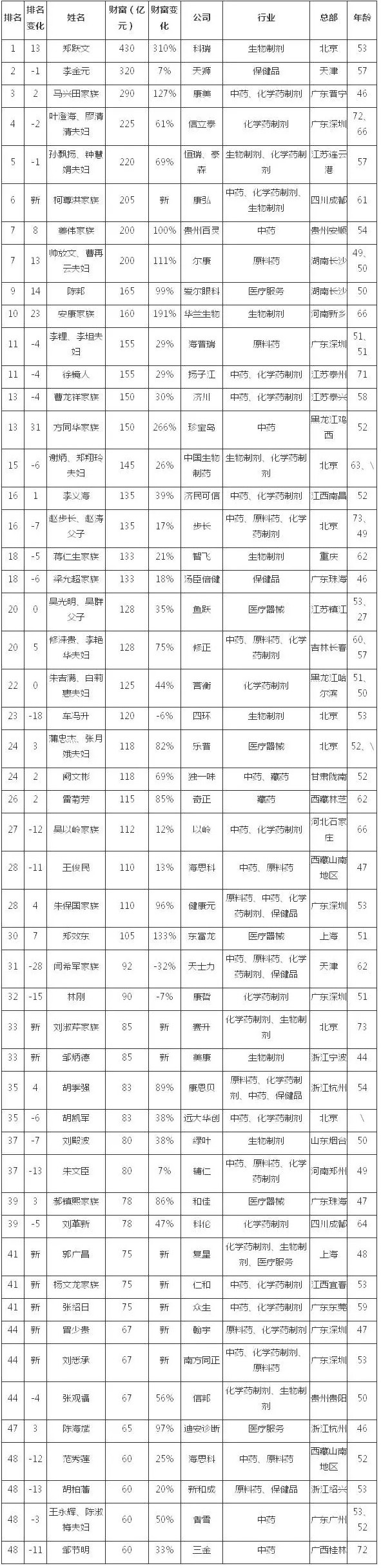 10月28日,胡润研究院发布胡润百富榜子榜之一《2015胡润医药富豪榜(HurunPharmaceuticalRichList2015),这是胡润研究院连续第九次发布“胡润医药富豪榜”前50名。