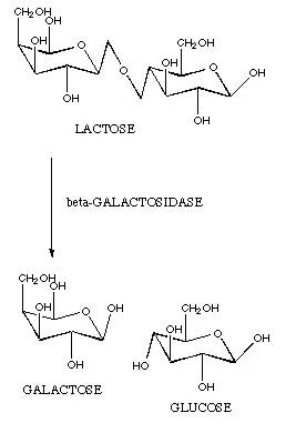 Lac 操纵子编码大肠杆菌乳糖代谢过程中需要的三种酶。其中 Lac Z 编码 β-半乳糖苷酶,也就是将乳糖水解成半乳糖和葡萄糖,过程如下。