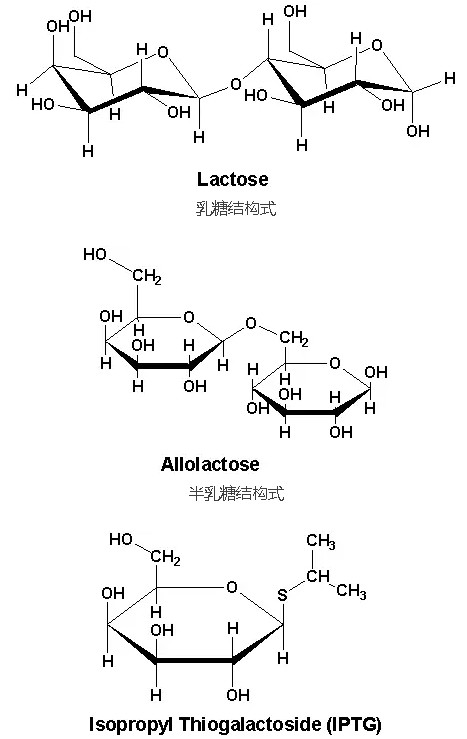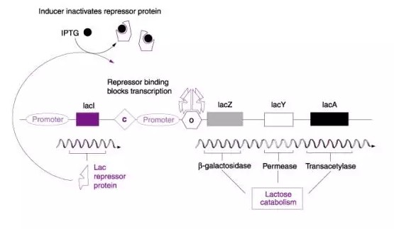 这个乳糖操纵子系列受阻遏蛋白调控,乳糖水平很低的时候,阻遏蛋白结合到启动子上,操纵子关闭。相反,如果乳糖存在,阻遏蛋白被抑制,转录就被诱导。此时 β-半乳糖苷酶就能正常催化乳糖。