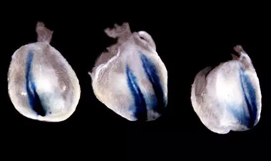看懂了过程中,我们就好理解蓝白斑筛选了,细胞中 β-半乳糖苷酶的活性可以用 X-gal 检测,如下图所示,小鼠胚胎中细胞特异性表达的鉴定也是利用这个原理。