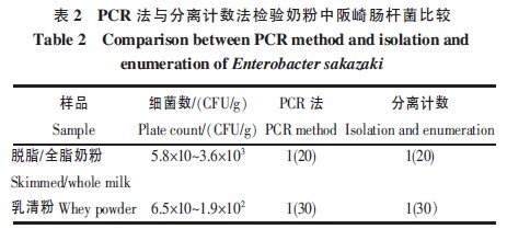 对50 份进口原料乳粉分离计数法和普通PCR法同时比对检测,以评价两种方法的符合程度,结果见表2。