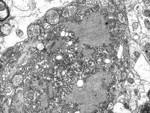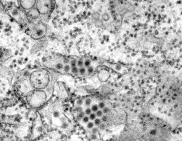 图片为电子显微镜拍摄的狂犬病病毒颗粒,显示病毒本身的颗粒结构,以及该圆形结构,称为内格里体,其中包含有病毒蛋白。狂犬病疫苗在20世纪20年代即推出,已经让狂犬病在发达国家极为罕见,但是该疾病在印度和非洲部分地区仍然是非常严重的问题。