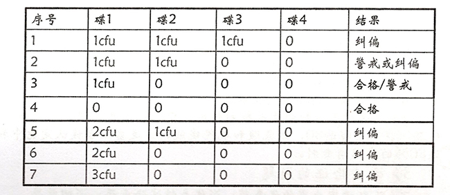 不合格结果:4个接触碟平均菌落数≥1cfu