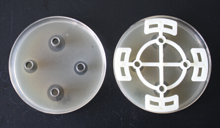 HB四连式牛津杯已经辐照灭菌,可以直接使用。用无菌镊子夹住HB四连式牛津杯正面的凸点(标有“海博生物”的为正面),将其放置在菌层培养基表面上,用压杯板放置在HB四连式牛津杯10秒左右,使其底部与培养基接触紧密,防止漏液。对角的2个小管分别滴入高浓度的抗生素溶液,另一对角的2个小管分别滴入低浓度的抗生素溶液。