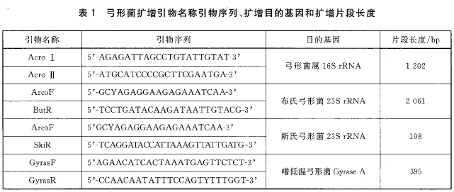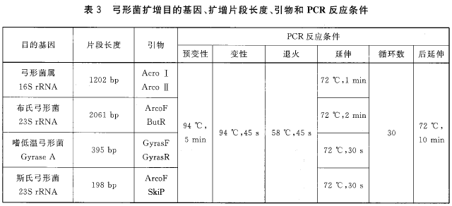 每次进行PCR检测均需要设置阳性对照、阴性对照和空白对照。其中,用布氏弓形菌、嗜低温弓形菌和斯氏弓形茵检测序列的DNA(或质粒)作为阳性对照.用非弓形茵的其他标谁茵株的DNA作阴性对照。用双蒸水替代模板作空白对照.