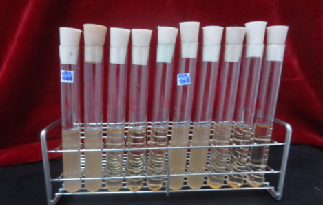 2.培养基分装后,两组试管内的培养基状态无明显区别,但上方试管空白处荧光区别明显(见图2)。