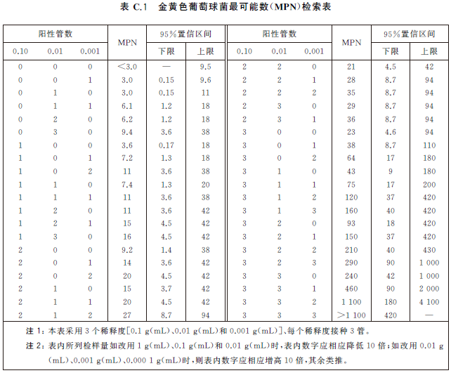 每g(mL)检样中金黄色葡萄球菌最可能数(MPN)的检索见表C.1。