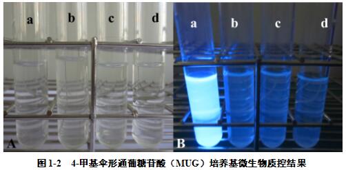 原理:蛋白胨提供碳氮源;硫酸锰、硫酸锌、硫酸镁、氯化钠和氯化钙提供各种离子可维持均衡的渗透压及利于目标菌的生长;磷酸二氢钾和磷酸氢二钠为缓冲剂;亚硫酸钠和去氧胆酸钠为选择性抑菌剂,抑制革兰氏阳性菌的生长。葡萄糖醛酸苷酶在碱性条件下,作用于4-甲基伞形酮-β-D葡萄糖醛酸苷(4-Methylumbellifery-β-D-Glucuronide简称MUG)的β糖醛酸苷键,使其水解,释放的4-甲基伞形酮在366nm紫外灯下产生蓝白色荧光。97%的大肠埃希氏杆菌、10%的沙门氏菌以及少量的志贺氏菌具有葡萄糖醛酸苷酶。