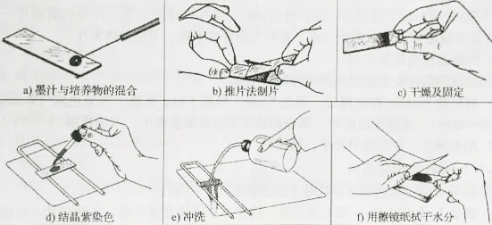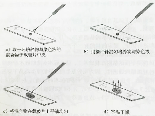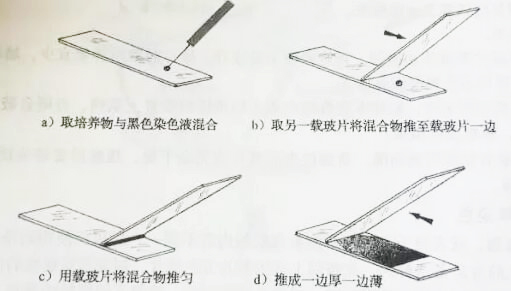 第二种方法是用一接种环苯胺黑与微生物混合,用接种针在载玻片的中央将混合物延伸很小的区域。具体操作如图所示: