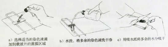 不同细菌或者由于观察者所侧重观察的内容不同,所以使用的染料也有差异,但是简单染色的方法是一样的。先按照上述的制片方法制片,制成需要观察的玻片后,使用相对应的染料滴加到玻片上的菌膜区域,以覆盖菌膜为准。按照不同染料的要求,结合所观察的内容确定染色时间,染色时间到达时,进行水洗,干燥等步骤。最后得到的玻片加盖盖玻片即可进行镜检。如有需要可以后续再进行油封、蜡封等封片过程。简单染色过程如下图: