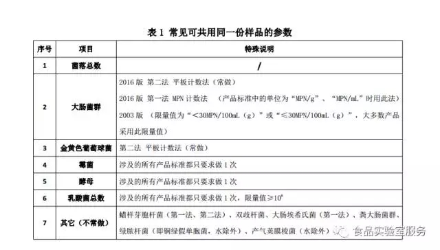 答:不同参数稀释方式相同时,即可共用同一份样品匀液进行检验检测(见表1)。有些参数对样品量或稀释液、增菌液有特殊要求的,则不可共用同一份样品匀液(见表2及表3)。