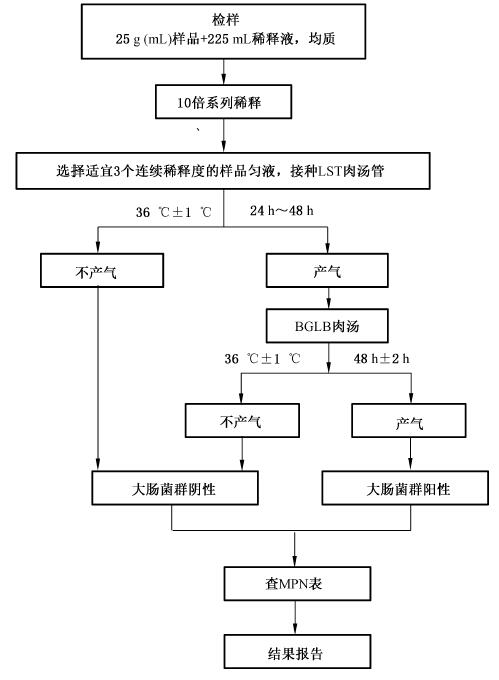 每个样品,选择3个适宜的连续稀释度的样品匀液(液体样品可以选择原液),每个稀释度接种3管月桂基硫酸盐胰蛋白胨(LST)肉汤,每管接种1mL(如接种量超过1mL,则用双料LST肉汤),36℃±1℃ 培养24h±2h,观察倒管内是否有气泡产生,24h±2h产气者进行复发酵试验(证实试验),如未产气则继续培养至48h±2h,产气者进行复发酵试验。未产气者为大肠菌群阴性。