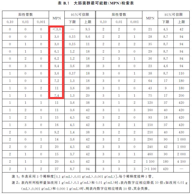 液体样品选作10ml*3、1ml*3、0.01ml*3,若结果全部阴性,报告为<0.03MPN/g;若有阳性管,查表,表中数字除以100报告。